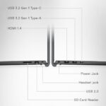 1. SD card reader | 2. USB 2.0 | 3. adset jack | 4. Power jack | 5. HDMI 1.4 | 6. USB 3.2 Gen 1 Type-A | 7. USB 3.2 Gen 1 Type-C (Data Only)