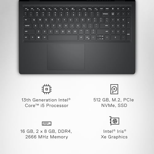 15.6-inch FHD (1920 x 1080) Anti-Glare LED Backlight Touch Narrow Border WVA Display13th Generation Intel Core i5-1334U (12 MB cache, 10 cores, 12 threads, up to 4.60 GHz)ProcessorIntel Iris Xe Graphics512 GB M.2 PCIe NVMe Solid State Drive16 GB, 2 x 8 GB, DDR4, 2666 MHz Memory
