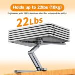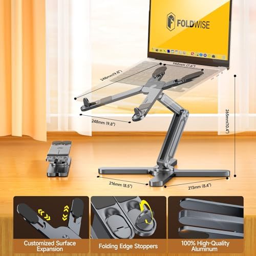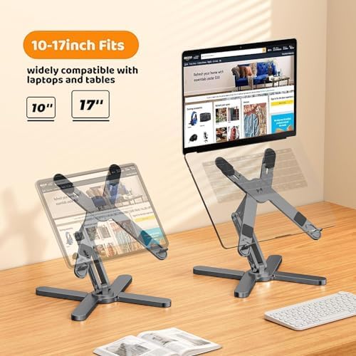 【Universal Compatibility】- Foldable laptop stand fits devices, ranging from 11 to 18 inches, like MacBook, Microsoft, ASUS, Dell, HP, Chromebook, and others. The stand functions effectively for various laptops, such as MacBook Pro, taller laptops, iPads, and tablets where both style and utility are seamlessly integrated.