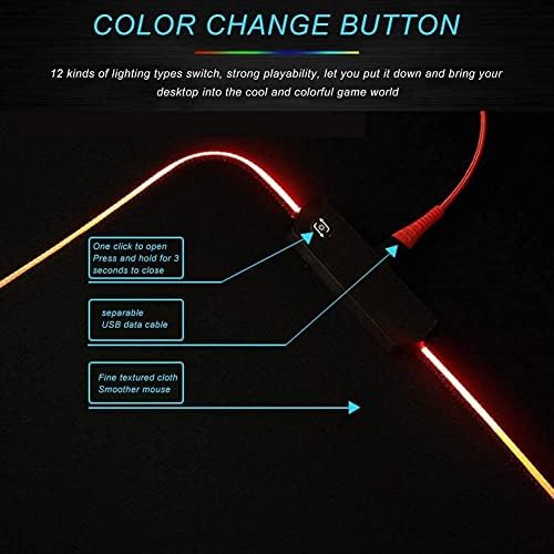 EASY TO USE: The gaming mouse pad is powered by USB. Plug and play, no driver needed with PC or laptop. One-touch control designed to switch the light colors and turn off, which is so convenient to use.