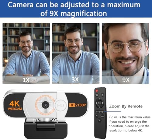 【Remote 1-9x Zoom& AI Auto-zoom】 select 2K and below resolution, you can enable EPTZ function, remote control can make the view zoom in and out 3 times. When zoomed in, the remote allows the view to move smoothly up, down, left and right.Our webcam AI will also automatically adjust the optimal focus to your scene.