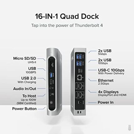 Plugable 16-in-1 Thunderbolt 4 Dock – Dual 4K Monitors for M4 MacBook Air/Pro, 100W Charging, 2X HDMI, 2X DisplayPort, 2.5G Ethernet, 7X USB, MicroSD/SD Card Reader, Audio, Windows & USB4 Compatible