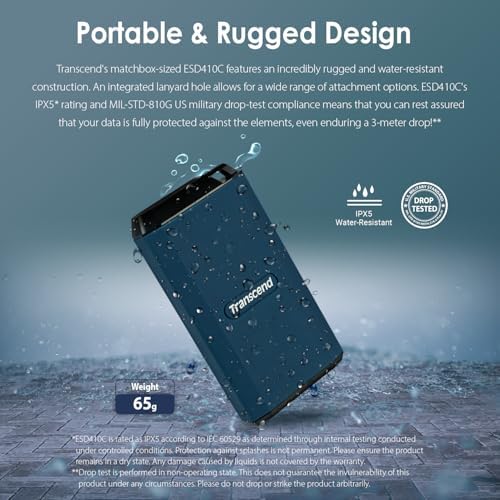 Transcend’s ESD410C portable SSD features blistering speeds and impressive durability. With a transfer rate up to 20Gbps, dealing with large files is virtually worry-free. Compliant with the US military-grade drop test, the compact ESD410C can endure a 3-meter drop and meets IPX5 standard, securing data inside with a high-level of protection, suitable for outdoor photographers, travelers, and content creators.