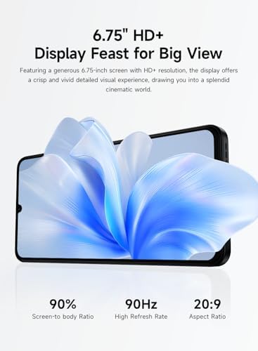 ★ 【6.75″ HD+ Large Display, Widevine L1 Certified Access HD Videos on Netflix, Disney+】Featuring a generous 6.75-inch screen with HD+ resolution, the display offers a crisp and vivid detailed visual experience, drawing you into a splendid cinematic world.(90% Screen-to body Ratio, 90Hz High Refresh Rate, 20 : 9 Aspect Ratio)