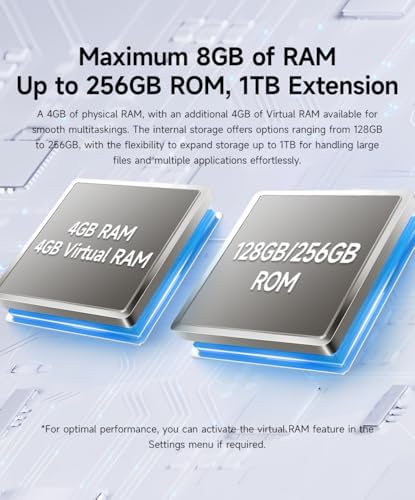 ★ 【Maximum 8GB of RAM, Up to 128GB/256GB ROM, 1TB Extension】A 4GB of physical RAM, with an additional 4GB of Virtual RAM available for smooth multitaskings. The internal storage offers options ranging from 128GB to 256GB, with the flexibility to expand storage up to 1TB for handling large files and multiple applications effortlessly.